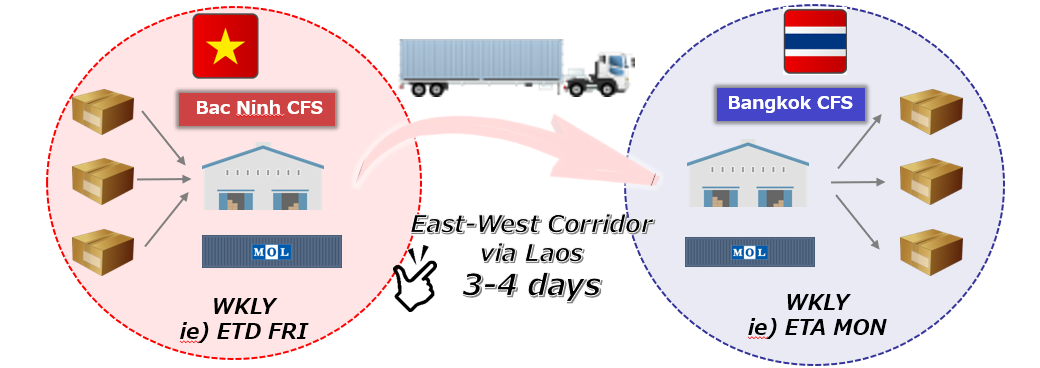 - Đối với vận chuyển xuyên biên giới sử dụng vận tải đường bộ từ miền bắc Việt Nam sang Lào đến Thái Lan, chúng tôi đang phát triển Dịch vụ Hợp nhất xuyên biên giới (CBT LTL). Chúng tôi kết hợp tuyến Quốc lộ xuyên suốt từ phía Bắc đến phía Nam Việt Nam với tuyến Hành lang Đông Tây ASEAN xuyên qua Miền Trung Việt Nam, để thiết lập 1 tuyến dịch vụ đường bộ dài 1600km từ miền Bắc Việt Nam đến tất cả các vùng của Thái Lan (xuyên qua Lào). Chúng tôi chấp nhận các đơn hàng vận chuyển bao trọn xe và cả đơn hàng lẻ.